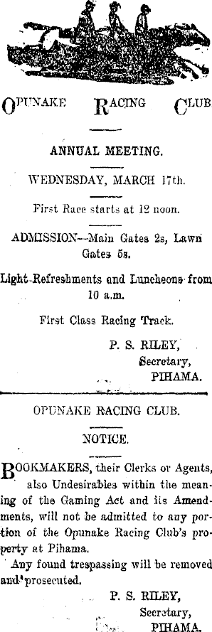 ANNUAL MEETING. WEDNESDAY, MARCH 17th. First Race starts at 12 noon. ADMISSION—Main Gates 2s, Lawri Gates ss, Light -Refreshments and Luncheons- from 10 a.m. First Class Racing Track. P. S. RILEY, Becretary, PIHAMA. OPUNAKE RACING CLUB. OOOKMAKERS, their Clerks or Agents, also Undesirables within the meaning of the Gaming Act and its Amendments, will not he admitted to any portion of the Opunake Racing Club's property at Pihama. ' Any found trespassing will be removed aJHl'proseeuted. ... P. S. RILEY, Secrataxy, i.V.. PIHAMA.