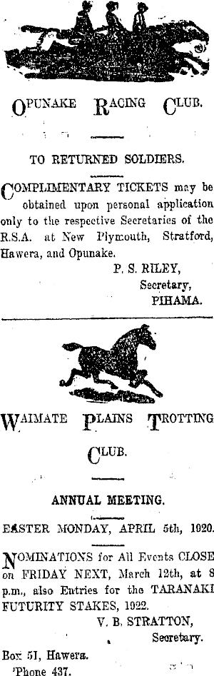 QPUNAKE RACING £JLUB. TO RETURNED SOLDIERS. COMPLIMENTARY TICKETS may be obtained upon personal application only to the respective Secretaries of the R.S.A. at New Plymouth, Stratford, Hawera, and Opunake. P. S. RILEY, Secretary, PIHAMA. ANNUAL MEETING. EASTER MONDAY, APRIL sft, 1020. "VOMINATIONS for All Events CLOSE on FRIDAY NEXT, March 12th, at 8 p.m., also Entries for tho TARANAKI FUTURITY STAKES, 1922. V. B. STRATTON, , Secretary. Bos 51, Hawera. 'Phone 43T. '' '