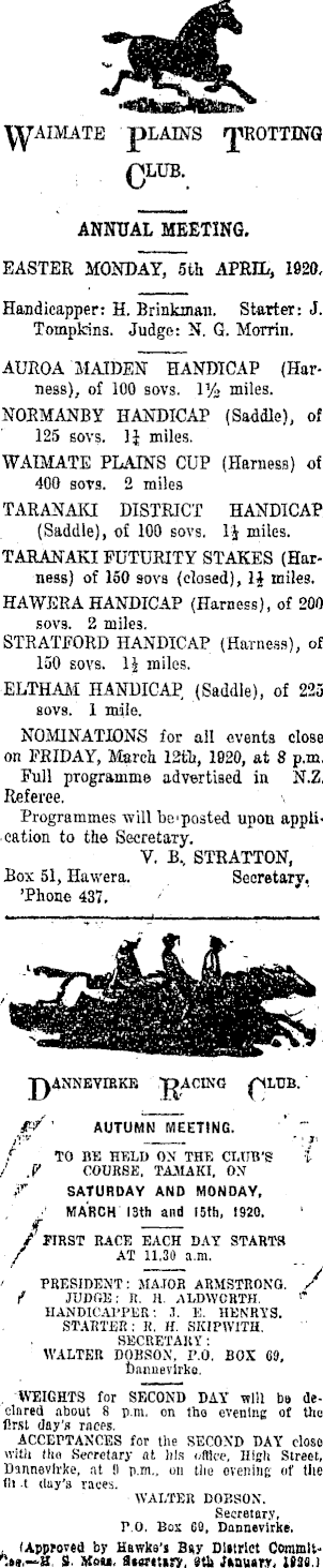 yyAIMATE pLAL¥S "TiROTTING QLUB. ANNUAL MEETING. EASTER MONDAY, sth APRIL, 1920, Handicapper: H. Brinkman. Starter: J. Tompkins. Judge: N. G. Morrin. AUROA MAIDEN HANDICAP (Harness), of 100 sovs. 1% miles. NORMANBY HANDICAP (Saddle), of 125 sovs. 1| miles. WAIMATE PLAINS CUP (Harness) of 400 sovs. 2 miles TARANAKI DISTRICT HANDICAP (Saddle), of 100 sovs. li miles. TARANAKI FUTURITY STAKES (Harness) of 150 sovs (closed), 1J miles. HA WERA HANDICAP (Harness), of 200 sovs. 2 miles. STRATFORD HANDICAP (Harness), of 150 sovs. 1J miles. ELTHAM HANDICAP, (Saddle), of 223 sovs. 1 mile. NOMINATIONS for all events close on FRIDAY, March 12&, 1920, at 8 p.m. Full programme advertised in N.Z, Referee. Programmes will be'posted upon application to the Secretary. V. B v STRATTON, Box 51, Hawera. Secretary, 'Phone 437. UNNEYIRKB "PACING ff ' AUTUMN MEETING. _" TO BE HELD ON THE CLUB'S i .C COURSE, TAMAKI. ON F SATURDAY AND MONDAY, ' MARCH 13th and 15th, 1920. / FIRST RACE EACH DAY STARTS / AT 11.30 a.m. PRESIDENT: MAJOR ARMSTRONG. / f JUDOE: I!. H. ALDWCRTH. '* HANDICAPPER: 3. K. HENRYS. STARTER: It. H. SKIPWITH. SECRETARY: WALTER DOBSON, P.O. BOX 09, . WEIGHTS for SECOND DAY will be declared about 8 p.m. on the evening of the first day's races. ACCEPTANCES for the SECOND DAY dose with (ho Secretary at his <>\ Dannevlrke, at !l p.m., on til r.O. Box OS, Dannevlrke. (Approved by Hawkn's B«y District Commlt',—H. S. Mou, fltaritiiy, «tl> Junuurr, IW.\