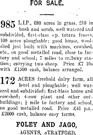 FOR SALE. 985 .1.P., 680 acres in grass, 210 in busli and scrub, well watered and subdivided, first-class s.p. totara fences, 100 acres ploughable; good house, wool-' shed just built with machines, cowshed, etc., on good metalled road, close to factory and school; 7 miles to railway station; carrying two sheep. Price £7 10s with £ISOO cash, balance arranged. ACRES freehold dairy farm, all level and ploughable; well watered and subdivided; first-fclass house and cowshed; 4-cow plant and other outbuildings; i mile to factory and school, on good metalled road. Price £4l p,a.. £2OOO cash, balance easy terms. FOLEY AND JAGO, AGENTS, oTRATFOKD.