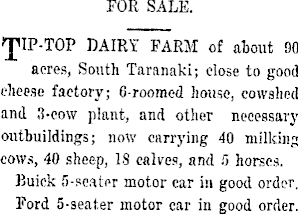 FOR SALE. DAIRY FARM of about AO acres, South Taranaki; close to good clieeac factory; 6-roomed house, cowshed and 3-cow plant, and other necessary outbuildings; now carrying 40 milking cows, 40 sheep, 18 calves, and 5 horses. Buick S-scater motor car in good order. Ford 5-seat.er motor car in good order.
