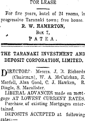 rOR LEASE For five years, hotel of 24 rooms, in progressive Taranaki town; free house. E. W. HAMERTON, Bos 7, " PATEA, THE TARANAKI INVESTMENT AND DEPOSIT CORPORATION, LIMITED. niRECTORP: Messrs. J. 3. Richards (Chairman), W. A. McCutchan, E. Marfell, Alan Good, C. J. Hawken, R, Dingle, S. Maeaiister. LIBERAL ADVANCES made on mortgage AT LOWEST CURRENT RATES. Purchase, of existing Mortgages entertained. DEPOSITS ACCEPTED at following rates:—