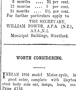 0 months .... 3i per cent. 12 months .... 5 per cent. 24 months .... 5% per cent. For further particulars apply to THE SECRETARY, WILLIAM POWER, A.P.A. (N.Z.), A.1.A.,^. Municipal Buildings, Stratford. WORTH CONSIDERING. JpfDIAN" IAI6 model Motor-cycle, in ffood order, complete with Dayton steel body side car, lamps, horiij etc. Price £lls.