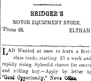 BRIDGET'S MOTOR EQUIPMENT STORE. 'Phone 68. ELTHAM Wanted at once to learn a firstclass trade, starting £1 a week and rapidly rising. Splendid chance for smart and Trilling boy,—Apply by letter to "Good Opportunity," News GSUa,
