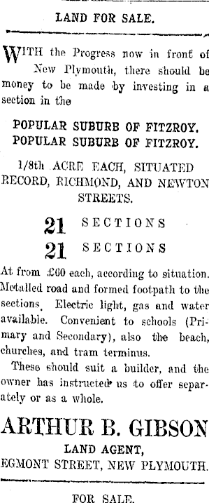 LAND FOR SALE. \yiTH the Progress now in front! of New Plymouth, there should be money to be made by investing in a section in the POPULAR SUBURB OF FITZROY. POPULAR SUBURB OP FITZROY. l/Btli ACRE EACH, SITUATED RECORD, RICHMOND, AND NEWTON STREETS. SECTIONS 21 SECTIONS At from £OO each, according to situation. Metalled road and formed footpath to the seetions_ Electric light, gas and water available. Convenient to schools (Primary and Secondary), also the beach, churches, and tram terminus. These should suit a builder, and the owner has instructed* us to offer separately or as a whole. ARTHUR B. GIBSON LAND AGENT, EGMONT STREET, NEW PLYMOUTH. FOR SALE.