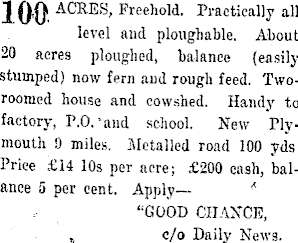 100 ACRES, Freehold. Practically all level and ploughable. About 20 acres ploughed, balance (easily stumped) now fern and rough feed. Tworoonied house and cowshed. Handy to factory, P.O.'and school. New Plymouth 9 miles. Metalled road 100 yds Price £l4 10s per acre; £2OO cash, balance 5 per cent. Apply— * "GOOD CHANCE, ~ c/o Daily News.
