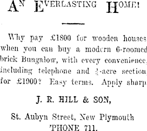 Why pay £IBOO fur wooden hoiwes, when you can buy a modern 6-roomed brick Bungalow, with every convenience, including telephone and i-acre section, for £1900? Easy te nna. Apply sharp. J. R. HILL & SON, St. Aubyn Street, New Plymouth 'PHONE 711.