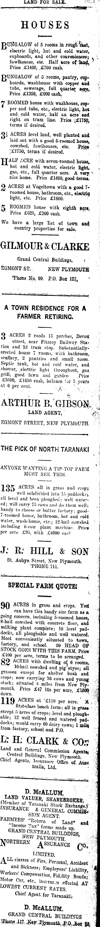 LAND FOR SALE. —■ ■r u 'li" HOUSES J>Ui?GALOW of 5 rooms ill rougi'dut, ■ electric light, hot and cold water, cupboards, and other conveniences; . ' fowlhouses, etc. Half acre of land, - Price £I4OO, ,£7OO cash. ' ' gUNGALOW of 6 rooms, pantry, cup- ■ boards, washhouse with copper and tubs, sewerage, full quarter acre, Price £1350, £GOO cash. ROOMED house with washhouse, copper and tubs, etc., electric light, hot and, cold water, half an acre' and right on tram line. Price [£1750, terms if desired, 02 ACRES level land, well planted and laid out with a good 5-roomed house, cowshed, fowlhouses, etc. Price ',£1750, teruis if desired. JJALF ACRE with seven-roomed house, hot and cold water, electric light, gas, etc., full quarter acre. A very v nice home. Price £I4OO, good ternu. Q ACRES at Vogeltown with a good 7* roomed house, bathroom, etc., electng light, etc. Price £IBOO. K ROOMED house with eighth JWJM. • Price £025, £3OO cash. We have a large list of town and country properties for sale. GILMOUR&CLARKE Grand Central Buildings, I I2GMONT ST.. NEW PLYMOUTH •Phone No. 90. P.O. Box 127, ' A TOWN RESIDENCE FOR A FARMER RETIRING, ACRES 2 roods 15 perches, Devoii street, near Fitzroy Railway Station and 2d tram stop. Substantiallyerected house 7 rooms, with bathroom, scullery, 2 pantries and small room. Septic tank, hot and cold water, and shower, -electric light throughout, gas grill, good lawn and garden Pi-ice £3fioo, £IGSO cash, bnltimie lar 5 years at 6 per cent. .j, . ' ARTHUR B. GIBSON. LAND AGENT,' EGMONT STREET, NEW PLYMOUTH. THE PICK OF NORTH TARANAKI ANYONE WANTING A TIP-TOP FARM MUST SHE THIS. 135 ACRES all in grass and crop; well subdivided into 15 paddocks; all level and been ploughed; well watered; will carry 7. r > cows and do Ihein well; handy to cheese or butter factory; good-7-roomed house, bathroom, hot and cold water, wash-house, etc.; 12-bail cowshed including (t-cow plant machine. I'rict) per acre £of), with £4OOO castJ: R: HILL & SON St. Aubyn Street, New Plymouth. 'PHONE 711. SPECIAL FARM QUOTE! 90 ACRES in grass and crops. Yoit can have this handy size farm as a going concern, including G-roomcd house, 8-bail cowshed with concrete floor, and milking plant complete; 10 level paddocks, all ploughable and well watered. Most conveniently situated to town, factory, and school. 50 HEAD OP STOCK GOES WITH THIS FARM. Price 1 £IOO per acre, terms to be arranged. 82 lv >th dwelling of 6 rooms, 10-bail cowshed nnd pig styes; all grassed except for shelter bush and crops; now carrying- 30 cows and young stock; situated 4 miles from New Plymouth. Price £47 10s per acre, £IOOO down. • ; 119 ACRES at '£lio per acre. 'A' , first-class beach farm; all in grass - except 5 acres of crops; level and ploughable; 12 well fenced and watered paddocks; would carry 60 dairy cows; 1 mile from factory, school and P.O. L: H. CLARK & CO.v Land and General Commission Agent* Central Buildings, New Plymouth. Chief Agents, Insurance Office of, Ausi tralia, Ltd. D. McALLUM, : fclON AGENT FARMERS. "Return of Land" and f °fras made up. GRAND CENTRAL BUILDINGS, 2fMV PLYMOUTH QO,, LIMITED. A LL «*««« of Fire, Penonal, Accident and Sickness; Employers' Liability, Workers Compensation, Fidelity Bondi; Motor Cor, etc., insmr.;o effected AT LOWEST CURRENT RATES Chief Agent for Taranaki; D. McALLUM. GRAND CENTRAL BUILDINGS jPQ, jfoy