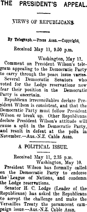 THE PRESIDENT'S APPEAL. VIEWS OF REPUBLICANS. By Telegraph.—Press Assn.—Copyright, Received May 11, 9.50 p.m. Washington, May 11. Comment on President Wilson's telegram appealing to the Democratic Party to carry through the peace issue vanes. Several Democratic Senators who voted for the Lodge reservations now fear their position in the Democratic Party is uncertain. Republican irreconcilables declare President Wilson is consistent, and that the Democratic Party must follow President Wilson or break up. Other Republicans declare President Wilson's attitude will cause a split in the Democratic Party, and result in defeat at the polls in November.—Aus.-N.Z. Cable Assn. A POLITICAL ISSUE. Received May 11, 2.35 p.m. Washington, May 10. President Wilson has formally called on the Democratic Party to endorse the' League of Nations, and condemn the Lodge reservations. Senator H. C. Lodge (Leader of the Republicans) has asked the Republicans to accept the challenge and make the Versailles Treaty the paramount campaign issue—Aus.-N.Z. Cable Assn,