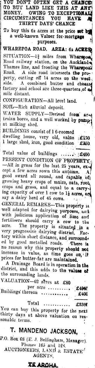 YOU DON'T OFTEN GET A CHANCER IXO BUY LAND LIKE THIS AT ANSTj MONEY. OWING TO EXCEPTHWAM CIRCUMSTANCES YOU HAVE j3 THIRTY DAYS' CHANCE To buy this 62 acres at the price nt 1 a well-known Vainer for mortgage purposes. WHAREPOA ROAD. AREA: 6a ACRES SITUATION—I} miles from WhartpoaL Road railway station, on the Thames line, and fronting the Whar*poai Road. A side road intersects €h« pro- ■ perty, cutting off 14 acres on the west, side. A combined butter and cheasa4 factory and school are three-quarters v of aJ mile distant. 1. CONFIGURATION—AII level land. SOlL—Rich alluvial deposit. WATER SUPPLY-—Derived from a !"•*<{ tesian bores, and a well worked by pittnpi at milking shed. J, BUILDINGS consist of 1 6-roomod dwelling house, very old, value ,£l5O 1 large shed, iron, good condition £260, Total value of buildings <£4oo PRESENT CONDITION OF PROPERTY. —All in grass for the last 25 years, ex-J cept a few acres sown this autivinn. A| good sward all round, and Capable 'oft growing heavy crops of maize, oats, foot crops and grass, and equal to a carry-1 ing capacity of over 1 cow to 1J acres, ooi say a dairy herd -of 45 cows. '» ' 1 I GENERAL REMARKS—This property is | well adapted for dairying purposes,, uni with judicious application of lime'and I fertilisers should carry a cow to the j acre. The property is situatedin a very progressive dairying district. Factory within short distance, and surroundcd by good metalled road?. There U no reason why this property should not increase in value, as time goes'on. <if prices for butter-fat are maintained, A Drainage Board is in operation in tie district, and this adds to the valuac of the surrounding lands. VALUATION—62 a?res at £BO per acre £4MC Buildings' thereon ' Total £S3M You can buy this property for the netl thirty days at above valuation 011 reasonable terms. * T. MANDENO JACKSON, (13. .1. Bellinphat liones 165 and 1 IEERS, LAN if & AGENTS, XKASOHA. P.O. Box 08 (13. .1. Bellinpham, Manager), Phones 165 and 12-i. AUCTIONEERS, LAN if & ftSTATK'' AGENTS,