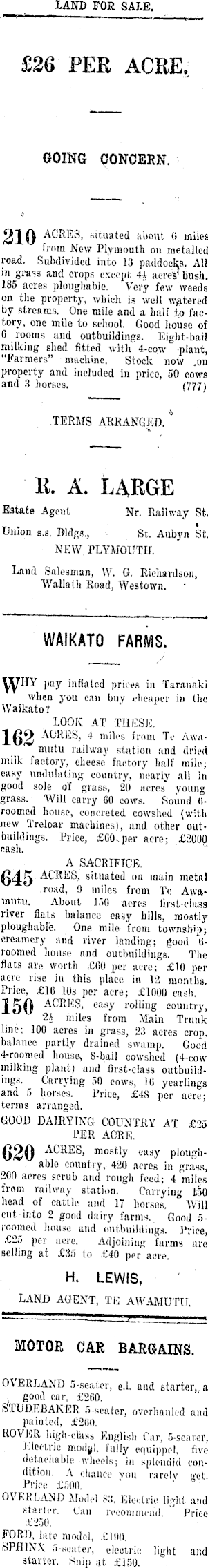 LAND FOR SALE. £26 PER ACRE, GOING CONCERN. 210 ACRES, situated about (> miles from New Plymouth 011 metalled road. Subdivided into 13 paddocks. All in grass and crops except 4A acre? busb. 185 acres ploughable. Very few weeds on the property, which is well watered by streams. One mile and a half to factory, one mile to school. Good house of 6 rooms and outbuildings. Eight-bail milking shed fitted with 4-cow plant, "Farmers" machine. Stock now .on property and included in price, 50 cows and 3 horses. (777) TERMS ARRANGED. * R. A. LARGE Estate Agent Nr. Railway St. Union s.s. Rldgs., St. Aubyn St. NEW PLYMOUTH. Laud Salesman, W. 6. Richardson, Wallath Road, Westown. WAIKATO FARMS. WHY pay inflated prices in Taranaki when you can buy cheaper in the Waikato» LOOK AT THESE. 162 AORIiS, 4 miles from Te Awamutu railway station and dried milk factory, cheese factory half mile; easy undulating country, nearly all in good sole of grass, 20 acres young grass. Will carry 00 cows. Sound 0roomed house, concreted cowshed (with new Treloar machines), and other outbuildings. Price, £oo,per acre; £2OOO cash. A SACRIFICE. 645 ACRES, situated on main metal road, 0 miles from Te Awamutu. About 150 acres lirst-ciass river flats balance easy hills, mostly ploughable. One mile from township; creamery and river landing; good 0roomed house and outbuildings. The flats are worth £GO per acre; £lO per acre rise in this place in 12 months. Price, £lO 10s per acre; £IOOO cash. 150 ACRES, easy rolling country, 2\ miles from Main Trunk line; 100 acres in grass, 23 acres crop, balance partly drained swamp. Good 4-roonied houso> S-bail cowshed (4-cow milking plant) and first-class outbuildings. Carrying SO cows, 10 yearlings and 5 horses. Price, £4B per acre; terms arranged. GOOD DAIRYING COUNTRY AT £25 PER ACRE. 620 ACRES, mostly easy ploughable country, 420 acres in grass, 200 acres scrub and rough feed; 4 miles from railway station. Carrying 100 head of cattle and 17 horses. Will cut into 2 good dairy farms. Good 5roomed house and outbuildings. Price, £25 per acre. Adjoining farms are selling at £35 to £4O per acre. H. LEWIS, LAND AGENT, TE AWAMUTU. MOTOR CAR BARGAINS. OVERLAND 5-seaier, e.l. and starter,, a , good car, £2OO. STUDEBAKER 5-seater, overhauled and painted, £2OO. ROVER high-class English Car, 5-seater, Electric niodjl, fully equippel, five detachable wheels; in splendid condition. A chance you rarelv "ct. Price £SOO. ' ' " OVERLAND Model 83, Electric light and starter. Can recommend. Price £'2so. FORD, late model, £ 1 HO. SPHINX 5-scater, electric light and starter. Snip at £l5O.