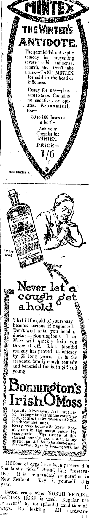 v tmm : P y k£i THEWNNTBtS ANTIDOTE. The germicidal, antiseptic remedy for preventing severe cold, influenza, catarrh, etc. Don't take a risk-TAKE MINTEX for cold in the head or influenza. Ready for use—pleasant to take. Contains no sedatives or opiates. Economical, too—--50 to 100 doses in a bottle. Ask your , Chemist for £ MINTEX. PRICE— I Never let a. , I. ahold* 1 That little csld of yours may. ' bacema serious if neglected. Don't wait until you need a j doctor Bonnington's Irish j m Moss will quickly help you I m throw it off. This splendid i remedy has proved its efficacy j by (50 long ye ; ars. It is the ! standard family cough remsdr jj and beneficial for both oJr> and Sj young. a "ii«iur «no»iuutc(to lie pluoed upon f t the market. Sp Mity Honning^l ?B9 Minions ot eggs have been preserved in Sharland's "Moa" Brand Egg Preservative. It is the standard preparation in New Zealand. Try it yourself this year. 22 """"'Xr - v "juenaiu condition always. No' leaking. All hardwaremen. ■
