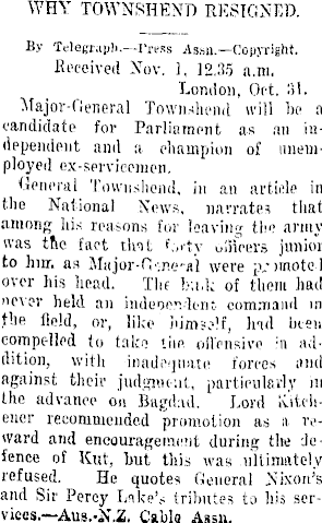 WHY TOWNSHEND RESIGNED. By Telegraph.— Press Assn.—Copyright. Received Nov. 1, 12.35 a.m. London, Oct. 31. Major-General Townshend will be a candidate for Parliament as an independent and a champion of unemployed ex-servicemen. General Townshend, in an article in the National News, narrates that among his reasons for leaving the army was tfie fact tint f,-,rty uiiicers junior to hur. as Major-Owe-Yl were p,-nnote! over his head. Tlic !>;i,k of them had never held an induoervlt-nt- command in the field, or, like himself, hid been compelled to take the. oll'ensive :n addition, with inadequate forces and against their judgment, particularly in the advance on Bagdad. Lord Ivitehener recommended promotion as n reward and encouragement during the defence of Kut, but this was .ultimately refused. He quotes General Nixon's and Sir Percy Lake'* tributes to his ser-vices.—Aus.-if.Z. Cabin Assn,