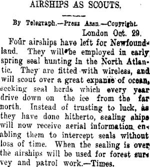 AIRSHIPS AS SCOUTS, By Telegraph.—fresa Asm.—Copyright London Oct 29. Four airships have left for Newfoundland. They will'toe employed in early, spring seal hunting in the North Atlantic. They are fitted with wireless, and will scout over a great expanse of ocean, seeking seal herds which every year drive down on the ice from the far north. Instead of trusting to luck, aa they have dono hitherto, sealing ehips will now receive aerial information, en* abling them to intercept seals without loss of time. When the sealing is ovet; the airships will be used for forest «1W vey and patrol work.—Times.