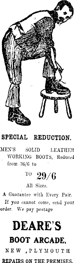 SPECIAL REDUCTION. HEX'S SOLID LEATHER WORKING BOOTS, Reduced from 30/6 to 10 29/6 All Sizes. A Guarantee with Every Pair. If you cannot come, send your order. We pay postage DEARE'S BOOT ARCADE. NEW .PLYMOUTH REPAIRS ON THE PREMISES.