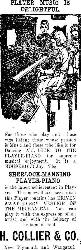 PLAYER MUSIC IS DELIGHTFUL. imm 8 Pot those who play and those who listen; those whoso passion is Music and those who like it for Dancing—ALL LOOK TO THE PLAYER-PIANO for .supreme musical enjoyment. It is a HOUSEHOLD Joy. The SHERLOCK-MANNING PLAYER-PIANO is the latest achievement in Players. The marvellous mechanism this Player contains has DRIVEN AWAY EVERY VESTIGE OF THE MECHANICAL. You can play it with the expression of an artist, and with the delicacy of the human hand. H. COLLIER & CO. New Plymouth and Wangar.ui.