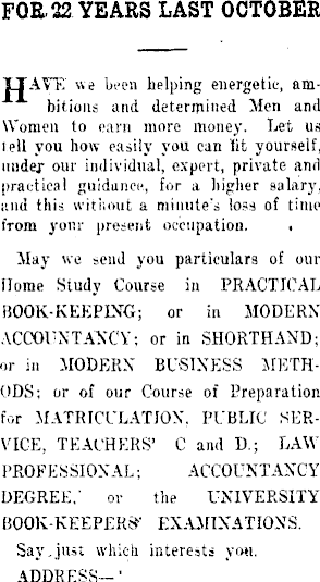 FOE. 22 YEARS LAST OCTOBER JJAVE we been helping energetic, ambitions and determined Men and Women to earn more money. Let us i ell you how easily you can lit yourself, under our individual, expert, private and practical guidance, for a higher salary, and this without a minute's loss of time from your present occupation. . May we send you particulars of our florae Study Course in PRACTICAL BOOK-KEEPING; or in MODERN' ACCOUNTANCY; or in SHORTHAND; or in MODERN BUSINESS METHODS; or of our Course of Preparation for MATRICULATION, PUBLIC SERVICE, TEACHERS' C and D.; LAW PROFESSIONAL; ACCOUNTANCY DEGREE,' or the UNIVERSITY BOOK-KEEPERS' EXAMINATIONS. Say.just which interests you. ADDRESS- 1