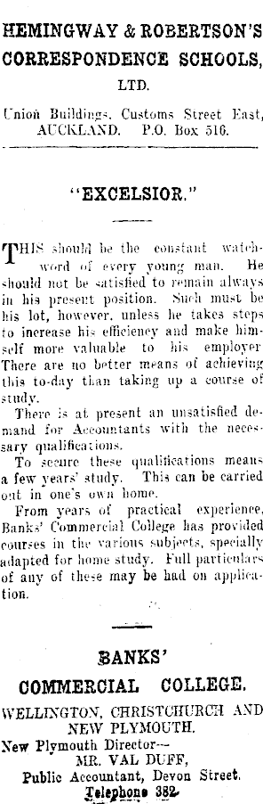 HEMINGWAY & ROBERTSON'S CORRESPONDENCE SCHOOLS, LTD. Union Buildinps, Customs Street East, AUCKLAND. P.O. Box 51S. "EXCELSIOR." rpHJS should lie the constant watchwr.rd cif every young man. He should not be satisfied to remain always in his present position. Sueli must be his lot, however, unless lie takes steps to increase his efficiency and make himself more valuable to his employer There are no better means of achieving this to-day than taking up a course of study. There is at present an unsatisfied demand for Accountants with the necessary qualifications. To secure these qualifications means a few years' study. This can be carried out in one's own home. From years of practical experience, Banks' Commercial College has provided courses in tin- various subjects, specially adapted for home study. Full particulars of any of these may be hail on application. BANKS' COMMERCIAL COLLEGE. WELLINGTON, CHRISTCHUKCH AND NEW PLYMOUTH. New Plvmouth Director—- * itR. VAL DUFF, Public Accountant, Devon Street, Ttlejbona 38>