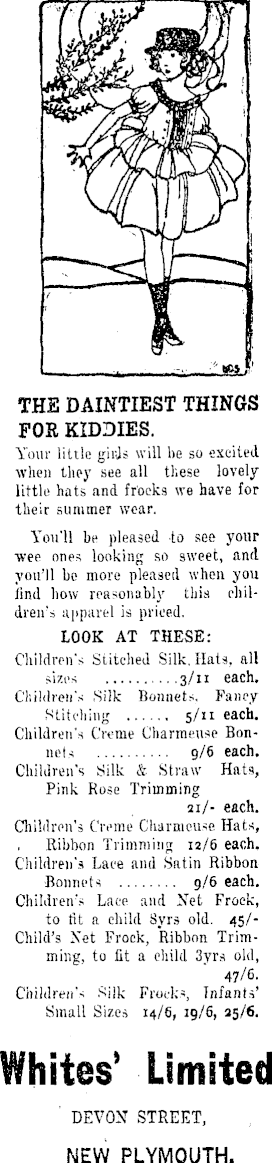 THE DAINTIEST THINGS FOR KIDDIES. Your little giris will be so excited when they see all these lovely little hats and frocks we have for their summer wear. You'll be pleased to see your ■wee ones looking so sweet, and you'll bo more pleased when you find how reasonably this children's apparel is priced. LOOK AT THESE: Children's Stitched Silk. Hats, all sizes 3/11 each. Children's Silk Bonnets. Fancy Stitching 5/11 each. Children's C'reme Charmeuse Bonnets 9/6 each. Children's Silk & Straw Hats, Pink Rose Trimming 21/- each. Children's C'reme Charmeuse Hats, Ribbon Trimming 12/6 each. Children's Lace and Satin Ribbon Bonnets 9/6 each. Children's Lace and Net Frock, to fit a child Syrs old. 45/Child's Xet Frock, Ribbon Trimming, to lit a child 3yrs old, 47/6. Children's Silk Frocks, Infants' Small Sizes 14/6, 19/6, 25/6. Whites' Limited DEVON STREET, NEW PLYMOUTH.