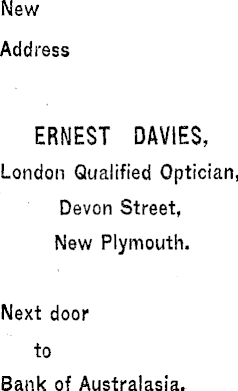 New Address ERNEST DAVIES, London Qualified Optician, Devon Street, New Plymouth. Next door to Bank of Australasia.