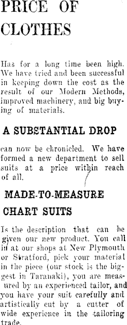 PRICE OF CLOTHES Has for a lung time been high. We have tried and been successful in keeping down the cost as the result of our Modern Methods, improved machinery, and big buying of materials. A SUBSTANTIAL DROP can now be chronicled. We have formed a new department to sell suits at a price within reach of all. f MADE-TO-MEASURE CHART SUITS Is the description that can be given our new product. You call in at our shops at Xew Plymouth or Stratford, pick your material in the piece (our stock is the biggest in Taranaki), you are measured by an experienced tailor, and you have your suit carefully and artistically cut by a cutter of wide experience in the tailoring trade.
