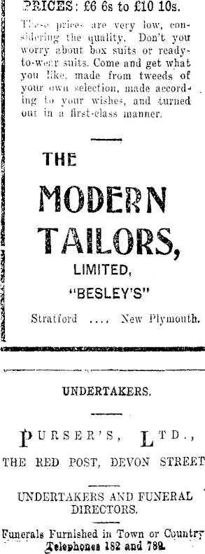 PRICES: £6 6s to £lO 10s. T!v-*' price.-; arc very low, considering the quality. Don't you worry about box suits or ready-to-Wii, n .r suits. Come and get what you like, made from tweeds of your own selection, made accord-' infr In your wishes, and turned out in a first-class manner. | THE MODERN TAILORS, ] LIMITED, j "BESLEY'S" Stratford .... New Plymouth. I C——B——BOKtmiMHH—B——B—> UNDERTAKERS. URSER' S , T D , , THE RED POST, DEVON STREET. UNDERTAKERS AND FUNERAL DIRECTORS. Funerals Furnished in Town or Country. JCele»lioß«a 182 and 78a