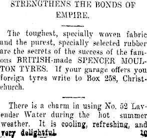 STRENGTHENS THE BONDS OF EMPIRE. The toughest, specially woven fabric and the purest, specially selected rubber are the secrets of the success of the famous BRITISH-made SPENCER MOULTON TYRES. If your garage offers you foreign tyres write to Box 258, Christelmrch. There is a charm in using No. 52 Lavender Water during the hot . summer weather. It is cooling, refreshing, and X»tj bUghtguL 10