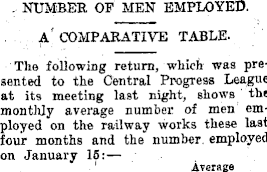 NUMBER OF MEN EMPLOYED. A COMPARATIVE TABLEThe following return, which was presented to the Central Progress League at its meeting last night, shows the monthly average number of men employed on the railway works these last four months and the number employed on January 15: Average