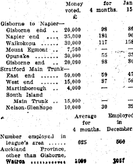 Money voted. 4 £ for -Tan. months. 15. Gisborne to NapierGisborne end .. 20,000 98 80 Napier end .... 35,000 1»1 96 Waikokopu 30,000 117 158 Mount Egmont .. 7,500 — — Opunake 30,000 55 33 Gisborne end 20,000 98 80 Stratford Main Trunk— East end 50.000 59 47 West end 15,000 87 59 Martiniborough .. 4,000 — — South Island Main Trunk .. 15,000 —— — N e Ison-Glen liope 10,000 30 32 Average Employed for in 4 months. December. Number employed m league’s area .... 625 566 Auckland Province, other than Gisborne, Wattoa 10it
