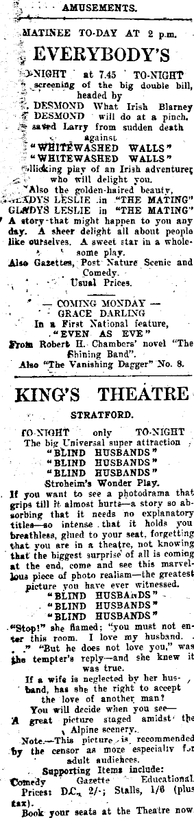 AMUSEMENTS. MLmATINEE TO-DAY AT 2 pm. ; EVERYBODY’S §gfc>-NIGHT at 7.45 TO NIGHT ■; screening of the big double bill, headed by Sk, DESMOND What Irish Blarney HP DESMOND will do at a pinch, saved Larry from sudden death Eg* . against « WHITEWASHED WALLS ” jggjg “ WHITEWASHED WALLS ” rej&llidking play of an Irish r- 'Zjfr* who delight you. Also the golden-haired beaut v, sSSrEXJJYS LESLIE in “THE MATING” GLADYS LESLIE in “THE MATING” * A story that might happen to you any day. A sheer delight all about people like ourselves. A sweet star in a wholesome play. Also Gazettes, Post Nature Scenic and Comedy. Usual Prices. * COMING MONDAY GRACE DARLING In a First National feature, “ EVEN AS EVE ” From Robert H. Chambers’ novel ‘ The Chining Band”. Also “The Vanishing Dagger” No. 8. KING’S THEATRE STRATFORD. fO NIGHT only TO-NIGHT The big Universal super attraction “BLIND HUSBANDS” “BLIND HUSBANDS” “BLIND HUSBANDS” Stroheim’s Wonder Play. If you want to see a photodrama that grips till rt almost hurts—a story so absorbing that it needs no explanatory titles—so intense that it holds you breathless, glued to your seat, forgetting that you are in a theatre, not knowing that the biggest surprise of all is coming at the end. come and see this marvellous piece of photo realism —the greatest picture you have ever witnessed. “BLIND HUSBANDS” “BLIND HUSBANDS” “BLIND HUSBANDS” “Stop!” she flamed; “you must not enter this room. I love my husband. . “But he does not love you,” was the tempter’s reply—and she knew it was true. If a wife is neglected by her husband. has she the right to accept the love of another man? You will decide when you see — A great picture staged amidst the x Alpine scenery. y o te.—This picture is recommended by the censor "as more especially f.>r adult audiehces. Supporting Items include: Comedv Gazette Educational. Prices: D.C., 2/-; Stalls, 1/6 (plus tax). Book your seats at the Theatre now.