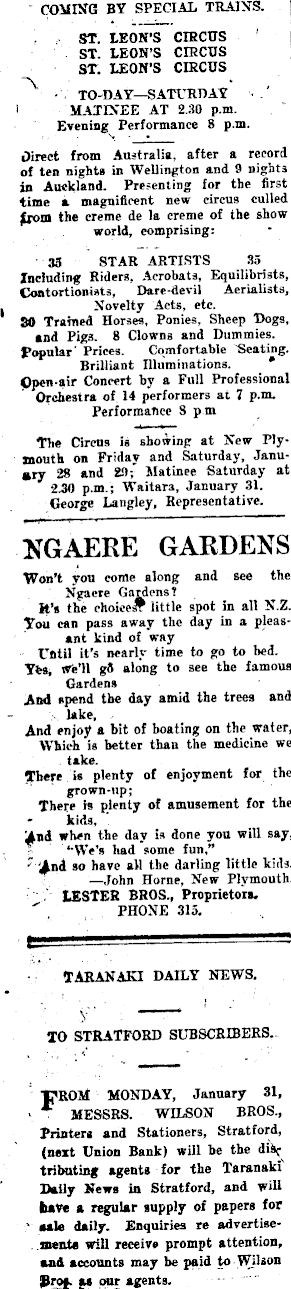 COMING BY SPECIAL TRAINS. ST. LEON’S CIRCUS ST. LEON’S CIRCUS ST. LEON’S CIRCUS TO-DAY—SATURDAY MATINEE AT 2.30 p.m. Evening Performance 8 p.m. Direct from Australia, after a record of ten nights in Wellington and 9 nights ■ in Auckland. Presenting for the first time a magnificent new circus culled from the creme de la creme of the show world, comprising: 35 STAR ARTISTS 35 Including Riders. Acrobats, Equilibrists, Contortionists. Dare-devil Aerialists, Novelty Acts. etc. ’ SO Trained Horses. Ponies. Sheep Dogs, | and Pigs. 8 Clowns and Dummies. 1 Popular Prices. Comfortable Seating. ! Brilliant Illuminations. ' j Open air Concert by a Full Professional Orchestra of 14 performers at 7 p.m. Performance S p m The Circus is showing at New Plymouth on Friday and Saturday, January 28 and 29; Matinee Saturday at J 2.30 p.m.; Waitara, January 31. George Langley, Representative. NGAERE GARDENS Won’t you come along and see the Ngaere Gardens? It’s the choice!? little spot in all N.Z. You can pass away the day in a pleasant kind of way Until it’s nearly time to go to bed. Ybs, we’ll gfl along to see the famous Gardens And spend the day amid the trees and lake, And enjoy a bit of boating on the water, Which is better than the medicine we take. There is plenty of enjoyment for the grown-up; There is plenty of amusement for the kids, ' when the day is done you will say, “We’s had some fun,” /nd so have all the darling little kids. —lohn Horne, New Plymouth. LESTER BROS., Proprietors. PHONE 315. TARANAKI DAILY NEWS. TO STRATFORD SUBSCRIBERS. "PROM MONDAY, January 31, C MESSRS. WILSON BROS., Printers and Stationers, Stratford, (next Union Bank) will be the distributing agents for the Taranaki Daily News in Stratford, and will have a regular supply of papers for sale daily. Enquiries re advertisements will receive prompt attention, and accounts may be paid to Wilson Brof. as our agents.