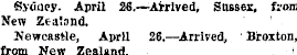 Syunej’. April 26.—Arrived, Sussex, from New Zealand. Newcastle, April 26. —Arrived, Broxton, from New Zealand.