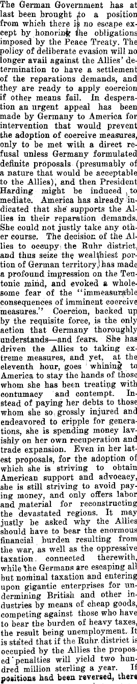 The German Government has at last been brought -to a position from which there is no escape except by honoring the obligations imposed by the Peace Treaty. The policy of deliberate evasion will no longer avail against the Allies’ determination to have a settlement of the reparations demands, and they are ready to apply coercion if other means fail. In desperation an urgent appeal has been made by Germany to America for intervention that would prevent the adoption of coercive measures, only to be met with a direct refusal unless Germany formulated definite proposals (presumably of a nature that would be acceptable to the Allies), and then President Harding might be induced 1 to mediate. America has already indicated that she supports the Allies in their reparation demands. She could not justly take any other course. The decision of the Allies to occupy the Ruhr district, and thus seize th? wealthiest portion of German territory,' has made a profound impression on the Teutonic mind, and evoked a wholesome fear of the “immeasurable consequences of imminent coercive measures.” Coercion, backed up by the requisite force, is the only action that Germany thoroughly understands—and fears. She has driven the Allies to taking extreme measures, and yet, at the eleventh hour, goes whining to America to stay the hands of those whom she has been treating with contumacy and contempt. Instead of paying her debts to those whom she so, grossly injured and endeavored to cripple for generations, she is spending money lavishly on her own recuperation and trade expansion. Even in her latest proposals, for the adoption of which she is striving to obtain American Support and advocacy, she is still striving to avoid paying money, and only offers labor and material for reconstructing the devastated regions. It may justly be asked why the Allies should have to bear the enormous financial burden resulting from the war, as well as the oppressive taxation connected therewith, while 'the Germans are escaping.all but noihinal taxation and entering upon gigantic enterprises for undermining British and other industries by means of cheap goods, competing against those who have to bear the burden of heavy taxes, the result being unemployment. It is stated that if the Ruhr district is occupied by the Allies the proposed‘penalties will yield two hundred million sterling a year. If positions had been reversed, there
