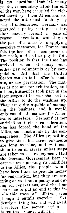 is no question that > Germany would, immediately after the end, of the war, have occupied the richest territory of the Allies, and exacted the uttermost farthing by way of indemnities. Germany has pursued a policy that places further leniency beyond the pale of reason. There is no. wobbling on the part of France as to applying coercive measures, for France has felt the, heel of the conqueror on her neck, and had to pay in full. The position is that the time has arrived iwhen Germany must either pay voluntarily or by compulsion. All that the United States can do is to offer to mediate, or use persuasion. The matter is not one for arbitration, and although America took part in the later stages of the war she has left the Allies to do the washing up. They are quite capable of managing the business, and it would only complicate matters for America to interfere. Germany is not entitled to further consideration. She has forced the hand of the Allies, and must abide by the consequences. The Allies are willing to give time, but large payments are long overdue, and will continue to be in arrear unless steps are taken to secure payment. Had the German Government been in earnest, over meeting its liabilities to the Allies, the people would have been taxed to provide money for redemption, but they are carrying on as if not a penny was owing for reparations, and the time has come to put an end to this intolerable state of affairs, even though it entails coercion. Evidently nothing but that will avail, therefore the sooner action is taken the better it will be.
