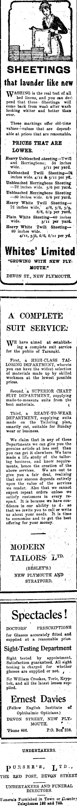r * SHEETINGS that launder like new is the real test of all bed linens, and you can depend that these Sheetings will come back from wash after wash looking whiter and better than ever. These markings offer old-time values—values that are dependable at prices that are reasonable. PRICES THAT ARE LOWER. Heavy Unbleached sheeting —Twill and Herringbone; 54 inches wide. 3/11 per yard. Unbleached Twill Sheeting—7£ inches wide. 4/11 & 5/11 per yd. Unbleached Herringbone Sheeting —72 inches wide. 5/6 per yard. Unbleached Herringbone Sheeting —BO inches wide. 6/6 per yard. Heavy White Twill Sheeting—• 72 inches wide, 4/6, 5/6, 5/9, 6/6, 6/9 per yard. Plain White Sheeting—Bo inches wide. 3/11 per yard. Heavy White Twill Sheeting--80 inches wide. 4/11, 6/6, 6/11 per yd. Whites* Limited "GROWING WITH NEW PLYL MOUTH.” DEVON ST., NEW PLYMOUTH. J A COMPLETE SUIT SERVICE. WE have aimed at establish-! ing a complete suit service for the public of Taranaki. First, a HIGH-CLASS TAILORING DEPARTMENT, wherein you can have the widest selection of materials made up by skilled workmen at the lowest possible prices. Second, a SUPERIOR CHART SUIT DEPARTMENT, supplying made-to-measure suits from the best materials. , Third, a READY-TO-WEAR DEPARTMENT, supplying suits made on the Tailoring plan, smartly cut, suitable for Sunday wear or business. We claim that in any of these Departments tvc can give you the genuine article at less cost than you can get it elsewhere. We have made a life study of the tailor- g ing business, and know require- g ments, hence the creation of the | above services. We are out to B give you a fair deal, realising g that our success depends entirely | upon the value of the services we render. Also that we cannot expect repeat orders unless we satisfy customers in every respect. It is because we have confidence in our ability to d» so that we invite you to call or write us about your needs. It is time to economise and to get the best offering for your money. MODERN TAILORS L TD (BESLEY’S.) NEW PLYMOUTH A2JD STRATFORD. Spectacles! DOCTORS’ PRESCRIPTIONS for Glasses accurately fitted and supplied at a reasonable price. Sight-Testing Department Sight tested by appointment. Satisfaction guaranteed. All sight testing is charged for whether glasses are supplied or not. f Sir William Crookes, Toric, Kryptok, and all the latest lenses supplied. Ernest Davies (Fellow English Institute of Ophthalmic Opticians.) DEVON STREET, NEW PLYMOUTH. * ’Phone 806. P.O. Box* 238. UNDERTAKERS. pURSER’S, L TD " THE RED POST, DEVON STREET. UNDERTAKERS AND FUNERAL DIRECTORS. Funerals Furnished in Town or Countrr. Telephones 182 and 789.