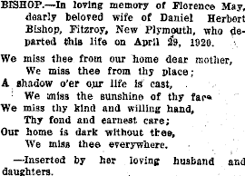 BISHOP.—In loving memory of Florence May, dearly beloved wife of Daniel Herbert Bishop, Fitzroy, New Plymouth, who departed t-hia life on April #9, 1920. We miss thee from our home dear mother, We miss thee from thy place ; A shadow o’er ojur life is cast, We uniss the sunshine of thy fac* W’e miss thy kind and willing hand. Thy fond and earnest care; Our home is dark without thee. We miss thee everywhere. —lnserted by her loving husband and daughters.