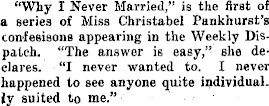“Why I Never Married,” is the first of a series of Miss Christabel Pankhurst’s tonfesisons appearing in the Weekly Dispatch. “The answer is easy,” she declares. “I never wanted to. I never happened to see anyone quite individually suited to me.”