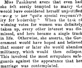 Miss Pankhurst avers that even had she felt sorely tempted to marry she would have considered herself unjustified • wi'g ’.€• her “quite special responsirliry for ksdership ” When the task of winning votes for women was definitely taken up, every other interest was dismissed, and hers became a single track in life. Otherwise, she asserts, the Government would have hoped and believed that sooner or later she would abandon militancy, which would then collapse. This involved the most scrupulous safeguards against the appearance that her marriage was contemplated.