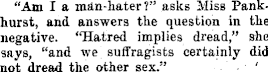 “Am I a man-hater?” asks Miss Pankhurst, and answers the question in the negative. “Hatred implies dread,” she says, “and we suffragists certainly did not dread the other sex.”