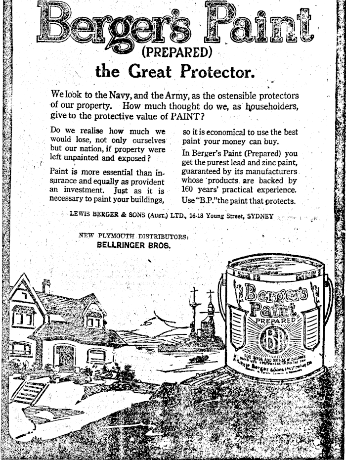I Baggerfe Phtat i (PREPARED) the Great Protector. We look to the Navy, and the Army, as the ostensible protectors of our property. How much thought do we, as hpuseholders, give to the protective value of PAINT ? |a we realise how much we so it is economical to use the best would lose, not only ourselves paint your money can buy. fe« but our nation, if property were r d >-n ■ m ji left unpainted and exposed? In ,^ rgers Pamt (Prepared) you p get the purest lead and zinc paint, Paint is more essential than in- guaranteed by its manufacturers surance and equally as provident whose products are backed by L'j| an investment. Just as it is 160 years’ practical experience, necessary to paint your buildings, Use “B.P.”the paint that protects. Ha H O LEWIS BERGER & SONS (AUST.) LTD., 16-18 Young Street, SYDNEY I 0 H NEW PLYMOUTH DISTRIBUTORS: BELLRINGER BROS. . f ifiSM