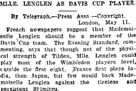 MLLE. LENGLEN AS DAVIS CUP PLAYER. By Telegraph.—Press Assn —Copyright. London, May 11. French newspapers suggest that Mademoiselle Lenglen should be a member of the Davis'Cup team. The Evening Standard, commenting, says that though not of the physical strength of Tilden, Mlle. Lenglen could play most of the Wimbledon players level, cutside the first eight. France first plays India, then Japan, but few would back Mademoiselle Lenglen against the tireless and persistent Skimitzu.