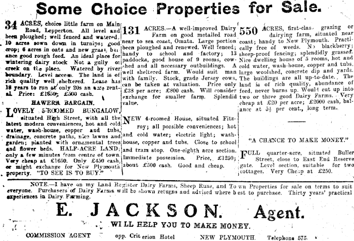 Some Choice Properties for Sale. A Rofd S ’ Lepperto“ ie ACKES.-A well-improved Dairy'R-Q ACRES, flrst-elas grazing or been ploughed; well fenced and watered. Farm on S ood metalled road dairying farm, situated near .10 acres sown down in tannins; - ood near to sea coast Oraata. Large portion coast; handy to New Plymouth. mct>• crop; 6 acres in oats and new gnu.. ba, [been ploughed and renewed. Well fenced; tally free of weeds. N>' blackberj . ance good rough feed. An idea? olace for>“ d y , to s j h “ ol and factory; 13 sheep-proof fencing; giasse* ™;paddocks, good house of 9 rooms, cow- Nice dwelling house ot o rooms, hot ana £tw»lr niF t • nlanv WaturoZhv* rixpri'^ an< * necessary outbuildings. A cold water, wash-house, copper and tubs, "hminriarr- Th 1a ' r»fi sheltered farm. Would suit man large woolshed, concrete dip and yards. mSitv U family. Stock, grade Jersey cows. Tim buildings are all up-to-date. The io _ q J i qo- - + can be taken at valuation. Price only land is of rich quality, abundance ot i n • S en £33 per acre: £BOO cash. Will consider feed, never burns up. Would cut up into u. rnee: tiwr, tow casn. 'exchange for smaller farm. Splendid two or three good Dairy Farms. Very HAWERA BARGAIN. lvalue. cheap at £2O per acre; £2OOO cash, balTOVELY a-RODMED BUNGALOW,' / nw 5 = P er cent '> long ternlsituated High Street, with all the. TUT W 4-roomed House, situated Fitz- ■ latest modern conveniences, hot and .-old a]] jb!e conveniences hot I water, wash-house, copper and tubs, . drainage, concrete paths, nice lawns and'"" 1 water; electric light; wash-1 _ garden; planted with ornamental treesjhouse, copper and tubs. Close to school A Ctf.AjXL.IL w jWAikn and flower beds HALF-ACRE LANDj an j tram s t O p. One-eighth acre section. t?cll ouarter-acre situated Buller only a few minutes * ram centre of town.-r „ . , . D . r quaiter acie, situated .nun er Very cheap at £16.50. Oniv £450 cash.!* te possession. J nee, £12o0; -Street, close to East End Reserve or might exchange for New Plymouth[.about £5OO cash. Good and cheap. .gate. Level section, suitable for two . property. “TO SEE IS TO BUY.'” I .cottages. Very Che.ip at £250. NOTE.— I have on my Land Register Dairy Fanns, Sheep Runs, and To wn Properties for sale on terms to suit everyone. Purchasers oc Dairy harms will be shown returns aud advised where best to purchase. Thirty years’ practical experiences m Dairy Fajrimng. 1 v r E. JACKSON. Agent. WI LL HELP YOU TO MAKE MONEY. COMMISSION AGENT opp. Criterion Hotel NEW PLYMOUTH. Telephone 575- >