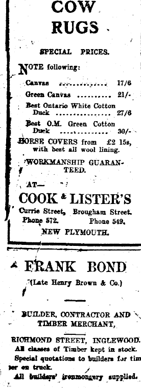 COW RUGS SPECIAL PRICES. fo owing: Canvas 17/6 r Green Canvas 217Best Ontario White Cotton Duck 27/6 Best O.M. Green Cotton Duck .... t 30/■HORSE COVERS from £2 15s, with best all wool lining. WORKMANSHIP GUARAN- ’ i TEED. AT—COOK & LISTER’S Currie Street, Brougham Street. * i Phone 572. Phone 549. NEW PLYMOUTH. * FRANK BOND (Late Henry Brown & Co.) f ’ BUILDER, CONTRACTOR AND TIMBER MERCHANT. RICHMOND STREET, INGLEWOOD. AM classes of Timber kept in stock. Special quotations to builders fur tim >er on truck. All builder,’ ironmongery eupplied.