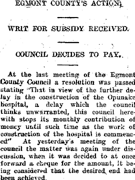 EGMONT COUNTY’S ACTION). WRIT FOR SUBSIDY RECEIVED. COUNCIL DECIDES TO PAY., At the last meeting of the Egmont County Council a resolution was passed statitig ‘That in view of the further delay in the construction of the Opuuake hospital, a delay which the council thinks unwarranted, tlxis council herewith stops its monthly contribution of money until such time as the work of construction of the hospital is commenced” At yesterday’s meeting of the council the matter was again under discussion, whan it was decided to at once forward a cheque for the amount, it being considered that the desired, end had been achieved