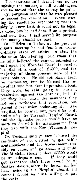 The chairman said that it was no use fighting the matter, as all would agree, and he moved that the money be paid. Cr. Ferguson said that he was pleased to second the resolution. When moving the resolution withholding the subsidy he knew that it could not be legally done, but he had done it as a protest, and now that it had served its purposei the money should be paid. Cr. O’Brien said that at the previous eight’s meeting he had found an extraordinary state of affairs, in that the chairman Mr. Fleming) told them that he fully believed the council intended to call upon the Hospital Board to erect a hospital at a cost of £6OOO, and the majority of those present were of the same opinion. He did not blame them for protesting, but he blamed the individual who put that impression about. They were, he said, going to move a resolution against the hospital, but after they had heard the members they not only withdrew that resolution, but passed a resolution endorsing it. The hospital, he pointed out, would be built and. run by the Taranaki Hospital Board, and the Opuuake people would' have no more to do with its management than thev had with the New Plymouth hospital. Gr. Tosiand said it now behoved the. residents of the district to get public contributions and the Government subsidy on these, and go ahead and build. The Minister thought that. £3500 would be an adequate sum. If thpy could get assurance that there would be no further delays. after the lesson all had had, including the Hospital Board, the council should be quite willing to pay the costs.