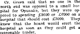 Cr. Green said that no one in the north end was opposed to a small hospital for Opunake, but they were opposed to spending £5OOO or £OOOO on a hospital that should cost £3OOO. They knew that the board would erect the hospital as soon as they could get a reasonable tender.