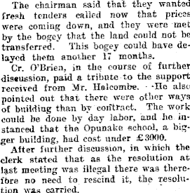 The chairman said that they wanted fresh tenders called now that prices were coming down, and they were met by the bogey that the land could not be transferred. This bogey could have delayed them another 17 months. Cr. O’Brien, in the course of further distussion, paid a tribute to the support received from Mr. Holcombe. He alsc pointed out that there were other ways of building than by contract. The work could be done by day labor, and ho instanced that the Opunake school, a bigger building, had cost under £3OOO. ° After further discussion, in which the clerk stated that as the resolution at last meeting was illegal there was therefbre no need to rescind it, the resolution was carried.