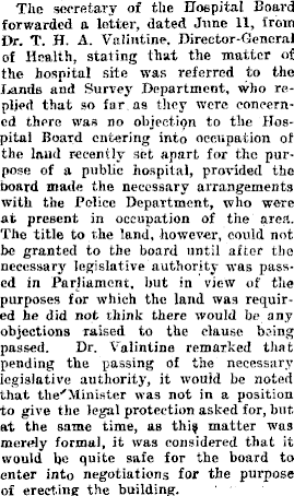 The secretary of the Hospital Board forwarded a letter, dated June 11, from Dr. T. H. A. Valintine, Director-General of Health, stating that the matter of the hospital site was referred to the Lands and Survey Department, who replied that so far as they were concerned there was no objection to the Hospital Board entering into occupation of the land recently set apart for the purpose of a public hospital, provided the board made the necessary arrangements with the Police Department, who were at present in occupation of the area. The title to the land, however, could not be granted to the board until after the necessary legislative authority was passed in Parliament, but in view of the purposes for which the land was required he did not think there would be any objections raised to the clause being passed. Dr. Valintine remarked that pending the passing of the necessary legislative authority, it would be noted that the z Minister was not in a position to give the legal protection asked for, but at the same time, as this matter was merely formal, it was considered that it would be quite safe for the board to' enter into negotiations for the purpose of erecting the building.