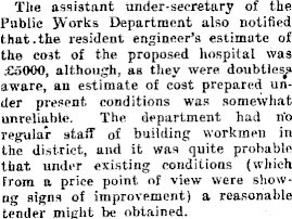 The assistant under-secretary of the Public Works Department also notified that.the resident engineer’s estimate of the cost of the proposed hospital was £5OOO, although, as they were doubtless aware, an estimate of cost prepared under present conditions was somewhat unreliable. The department had no regular staff of building workmen in the district, and it was quite probable that under existing conditions (which from a price point of view were showng signs of improvement) a reasonable tender might be obtained.