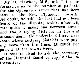 Mr. O. Hawken, M.P., asked for information as to the number of patients for the Opunake district that had been sent to the New Plymouth hospital. No doubt, he said, the last had not been heard of the dispute, which, after all, was quite a usual one between towns and the outlying districts in hospital management. He understood there were cases wfcere outlying districts were paying more than ten times as much per patient as the towns were. It was resolved to ask the secretary of the Hospital Board to supply the information.